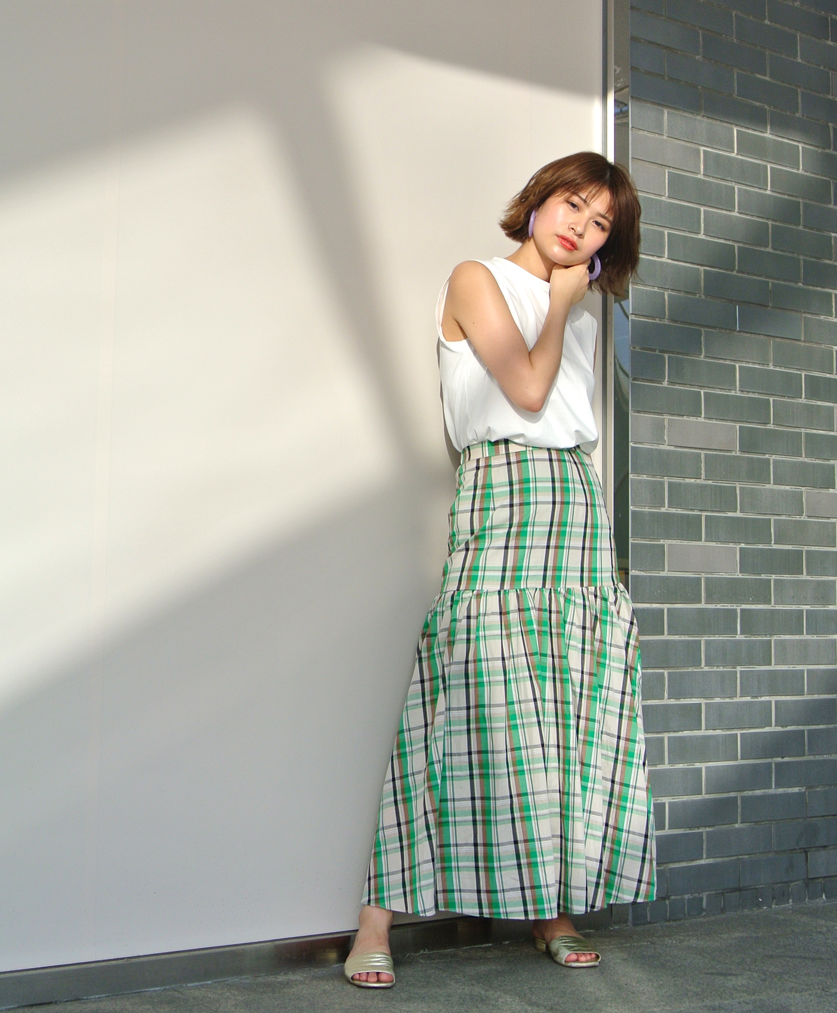 グリーンの切線がポイントのTeared Check Skirt