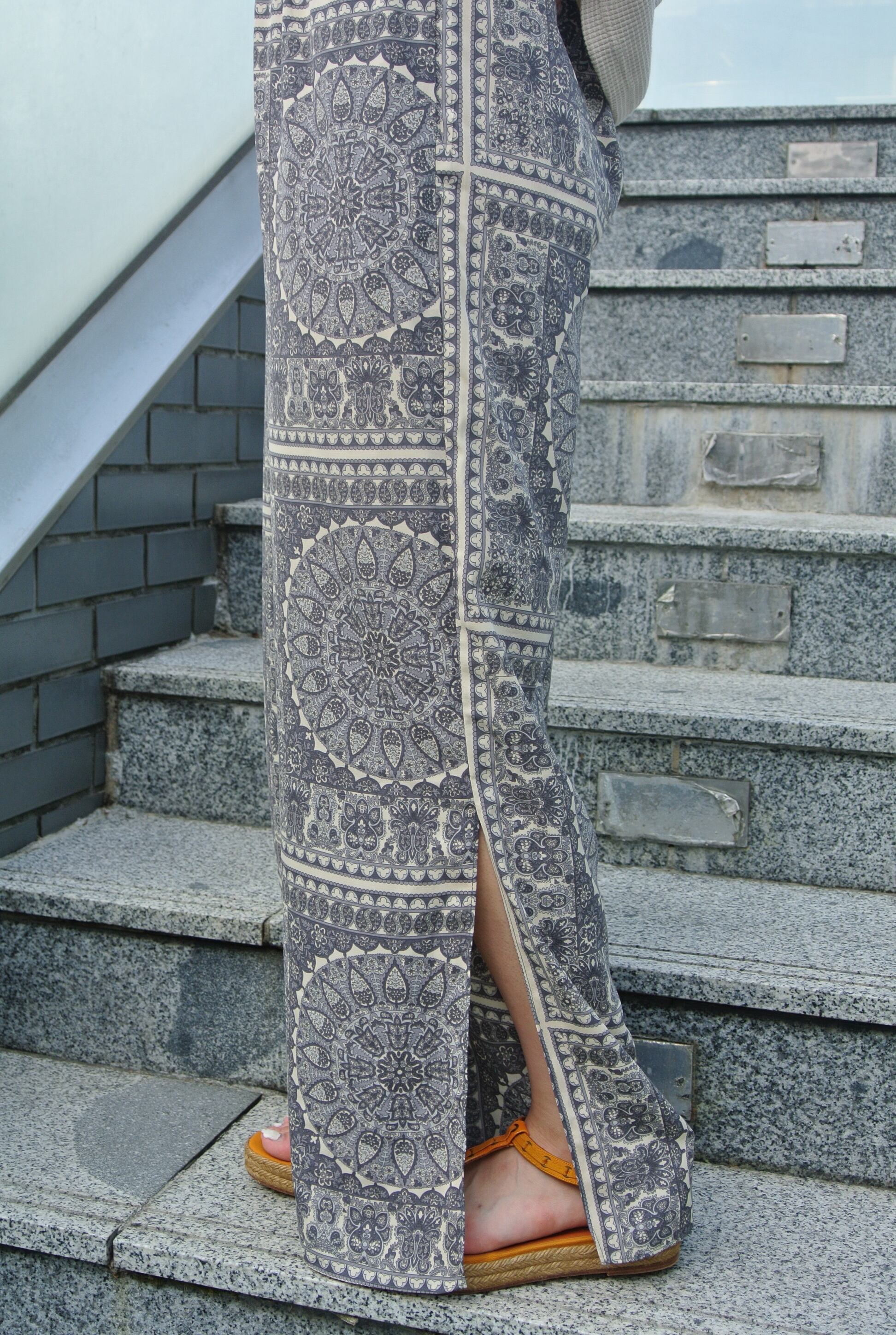 シルエットが綺麗な幾何学模様のプリントパンツ。サイドに深めのスリットが入ってるので、ワイドパンツながら重たいイメージならずに穿きこなせます。ウエストはゴム仕様で穿き心地の良さも抜群です。
