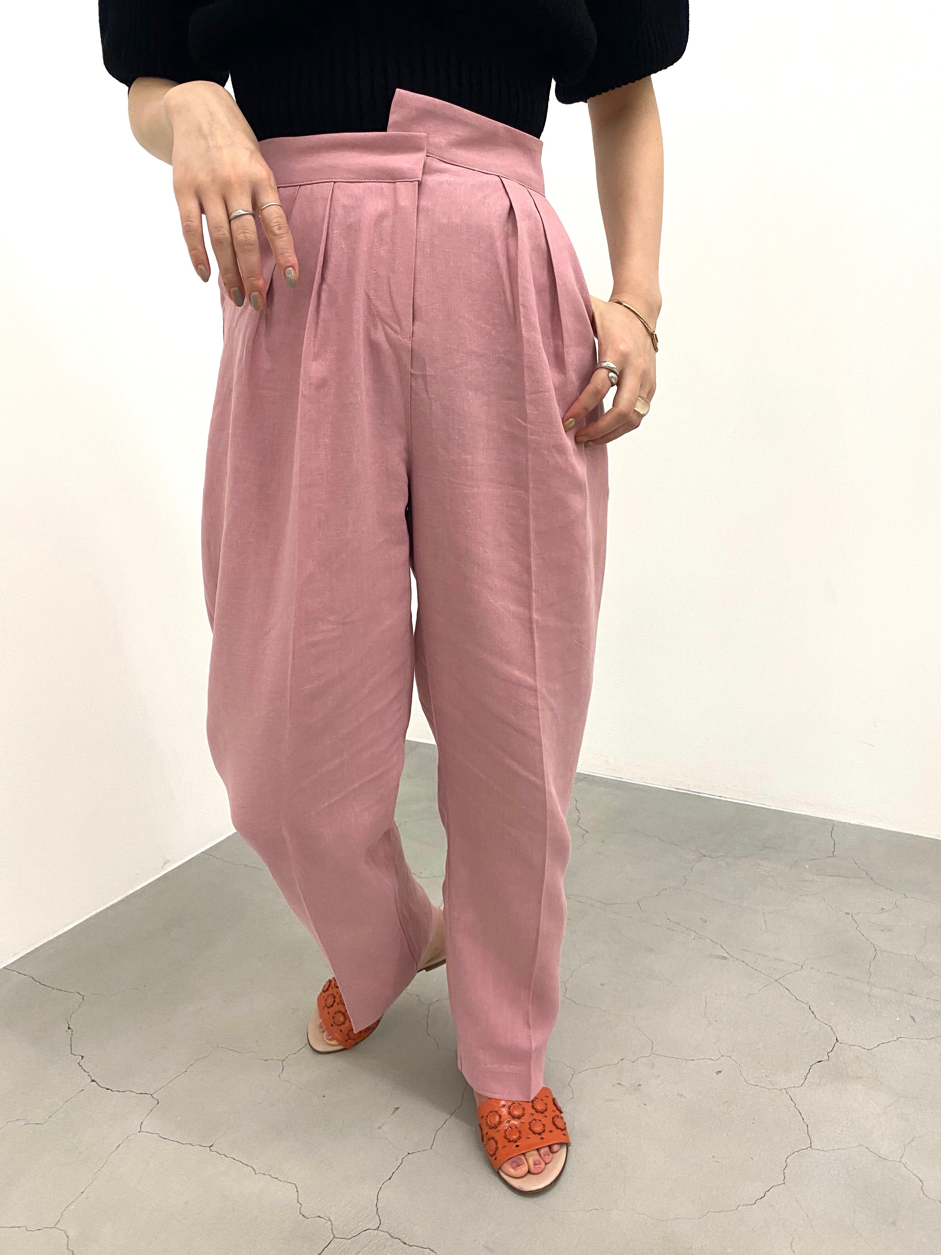 リネン100%なので、涼しげでゆったり着ていただけます。太ももの部分が太めで、だんだんと細くなっていくシルエットが足をきれいに見せてくれます。カラーも甘すぎないくすみピンクでコーディネートの差し色にもなります。