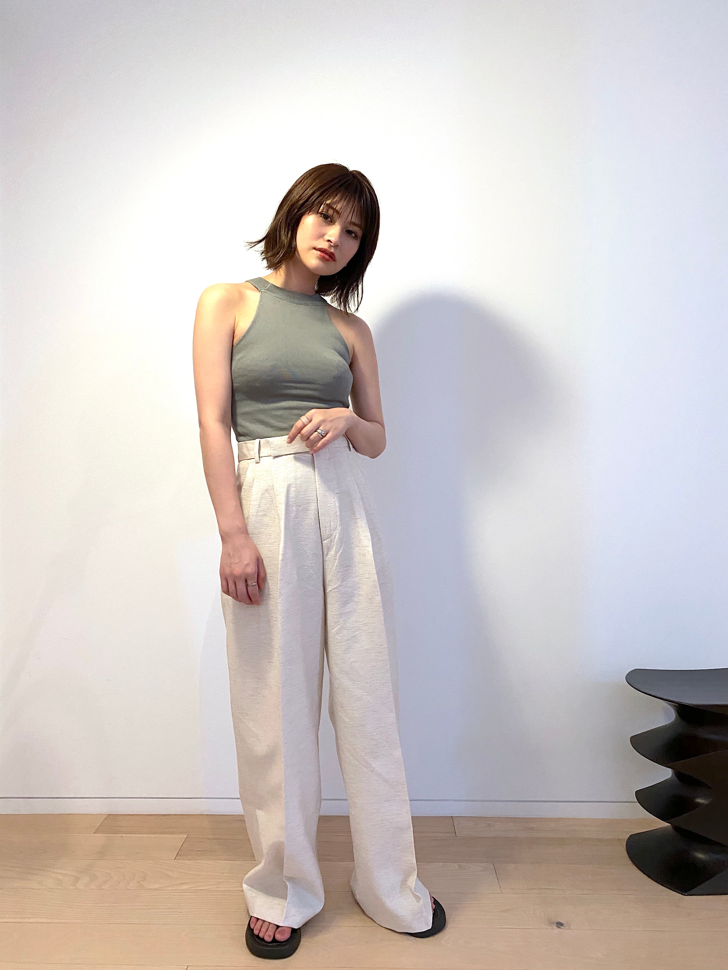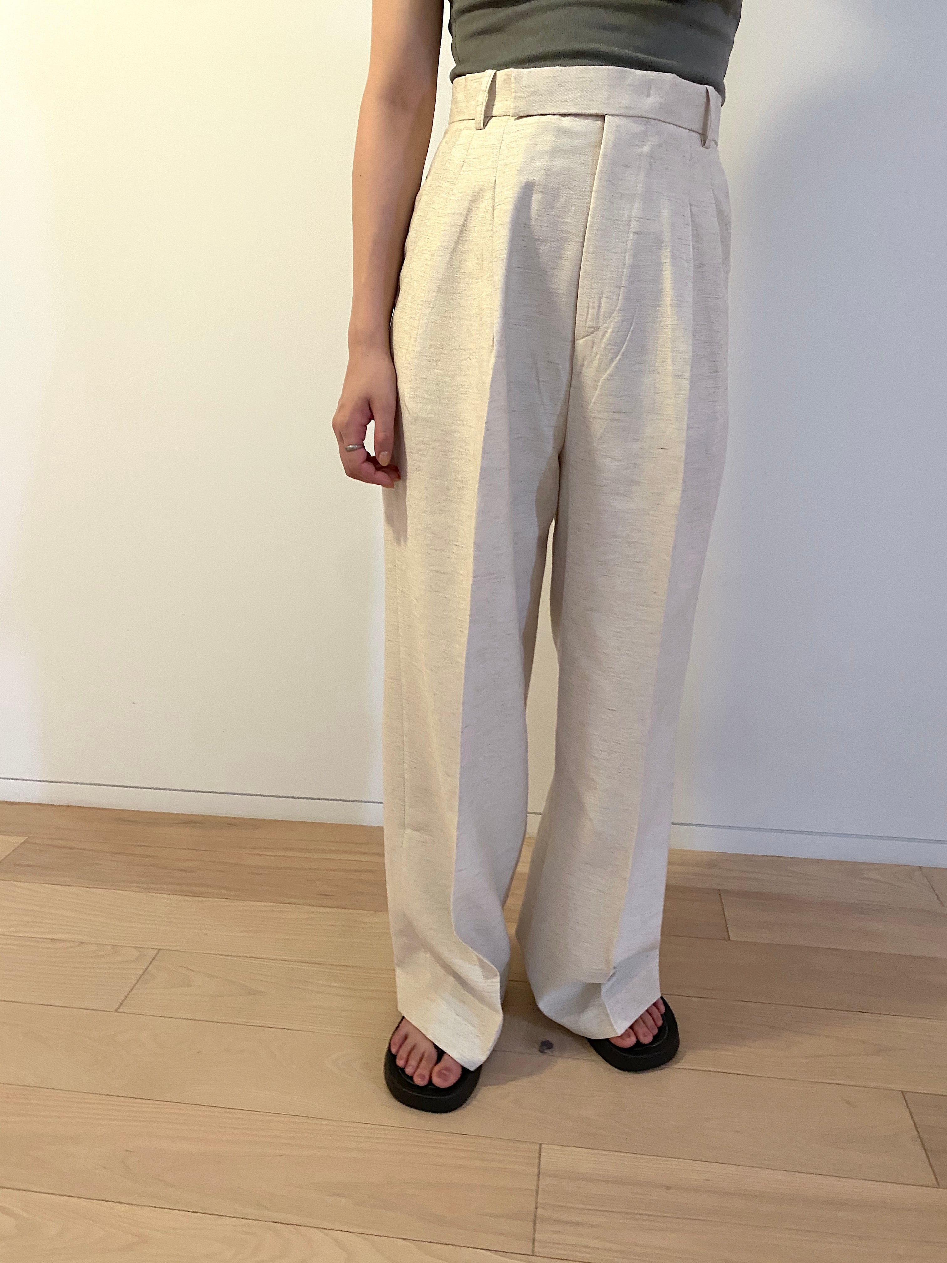 センターに入ったタックが、足を綺麗に見せてくれる一本。リネン混なので涼しくかつきれいめに着用して頂けます。サイズ感は大きめなので、通常S・M着用の方Sサイズををお勧めします。