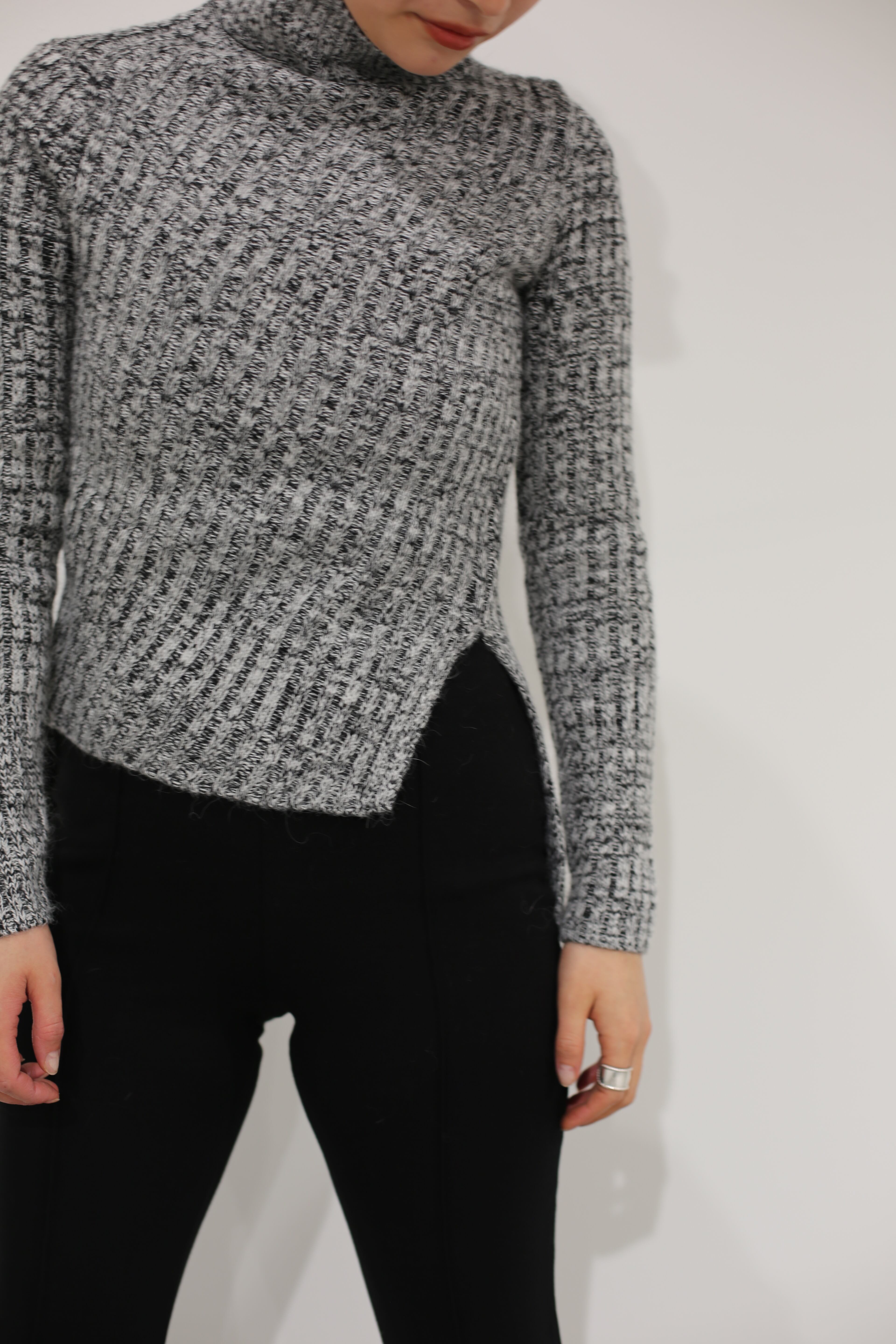 メランジのようなカラーで立体感を出してくれて、今年っぽい雰囲気を出してくれます。後ろ下がりになっており、前側も片サイドがスリットのようになっているのですっきりとしたメリハリのある体型に見せてくれます。