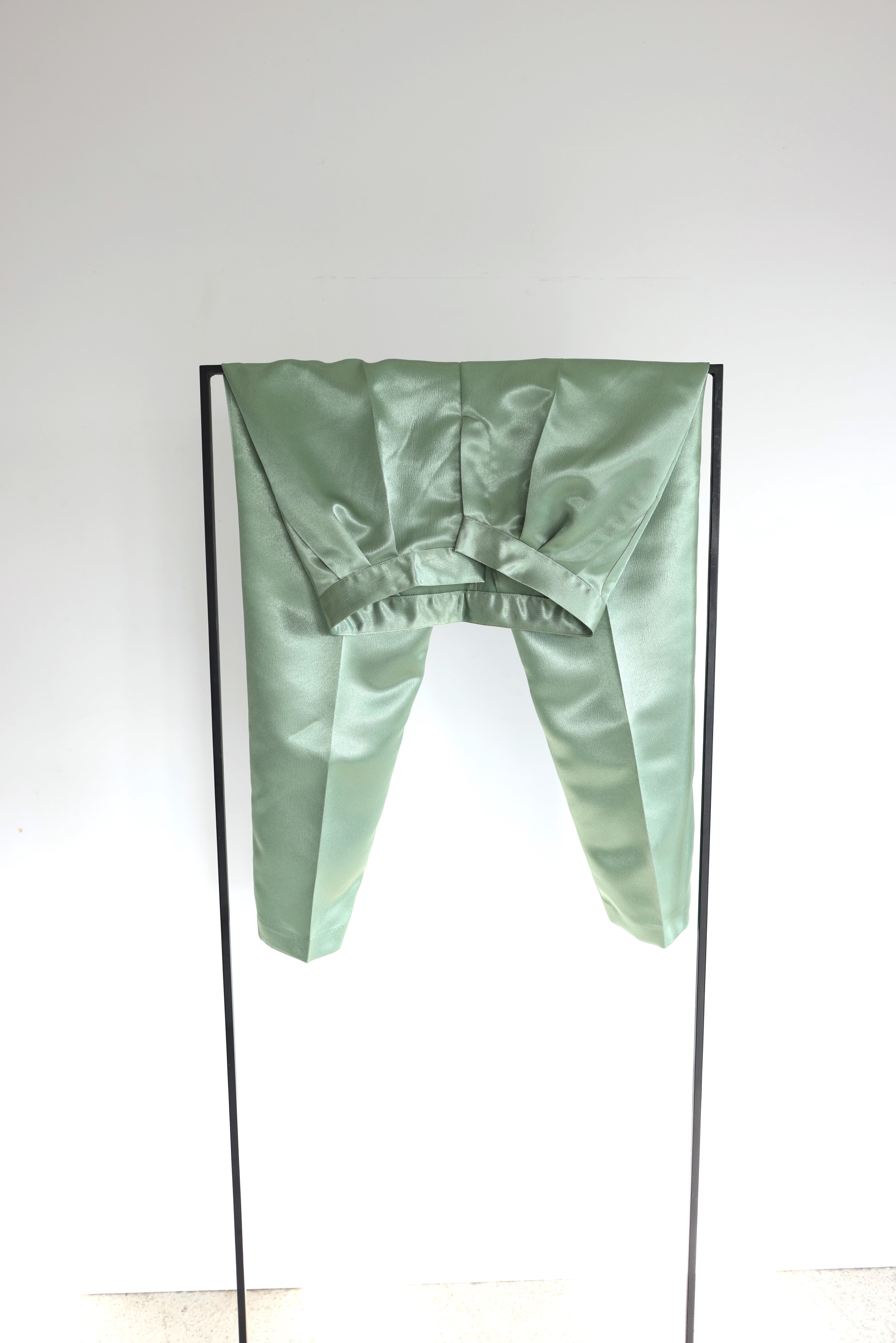 ウエスト部分が重なったようなデザインで目を引くサテンパンツ。センタープレスがされているので、足を綺麗に見せていくれます。muscatは少し厚手のサテンでハリ感が少しあります。mocoはテロっとした柔らかい素材なのでリラックスムードで着用していただけます。
