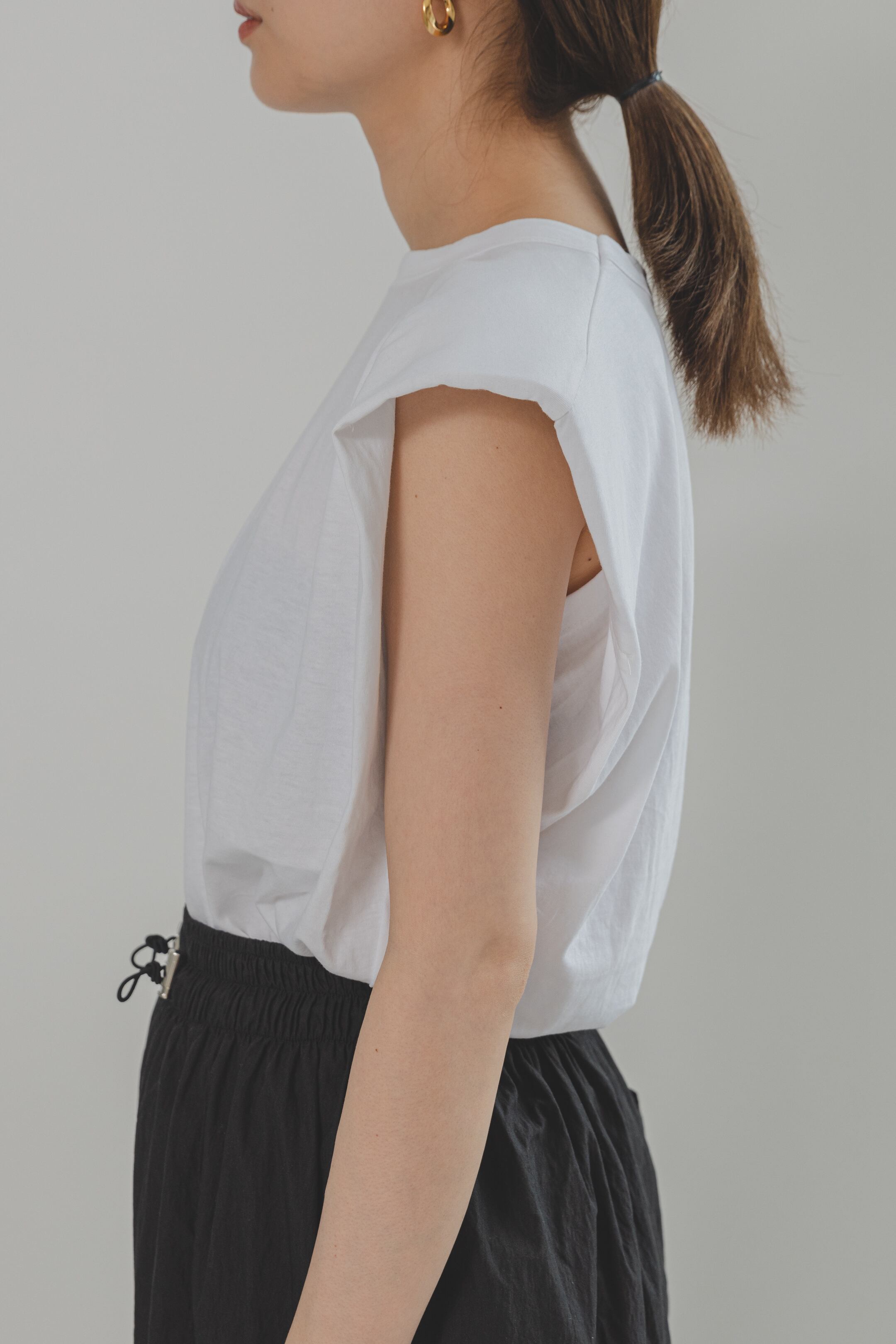 ショルダーディティールがアクセントのノースリーブ。コットン生地を使用しているのでサラリと着れて、ボトムスを問わずに合わせられます。この夏主役になる一枚です。